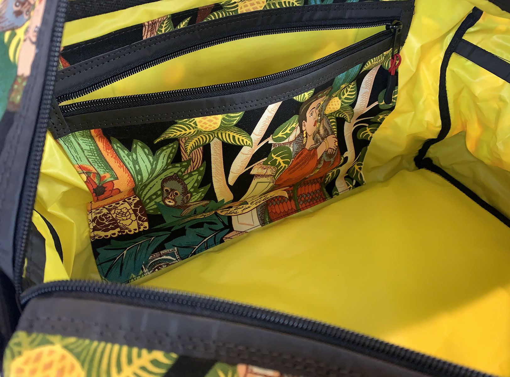 Flamboyant Frida Kahlo jungle print made from linen fabric and many colours of internal lining materials to choose from, waterproof sail cloth base.